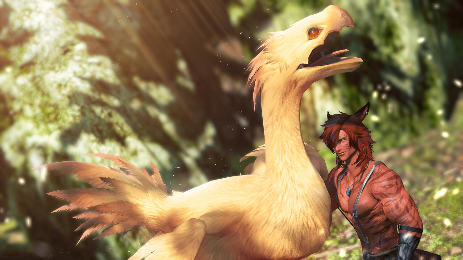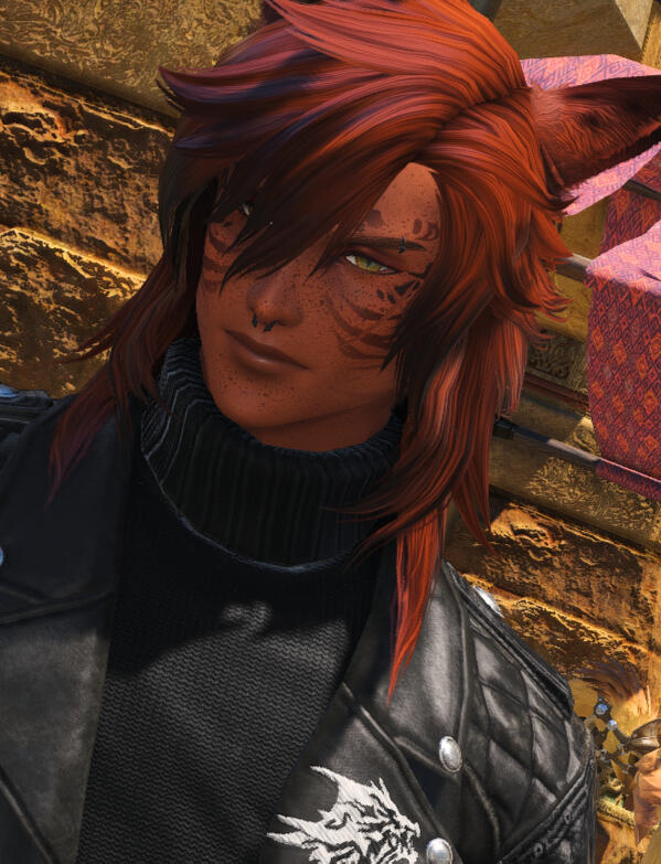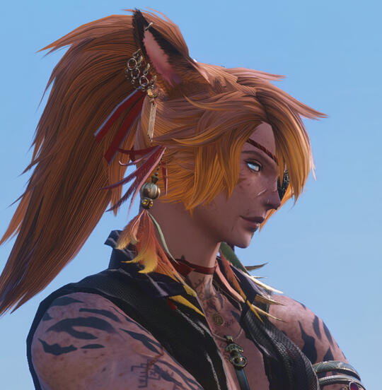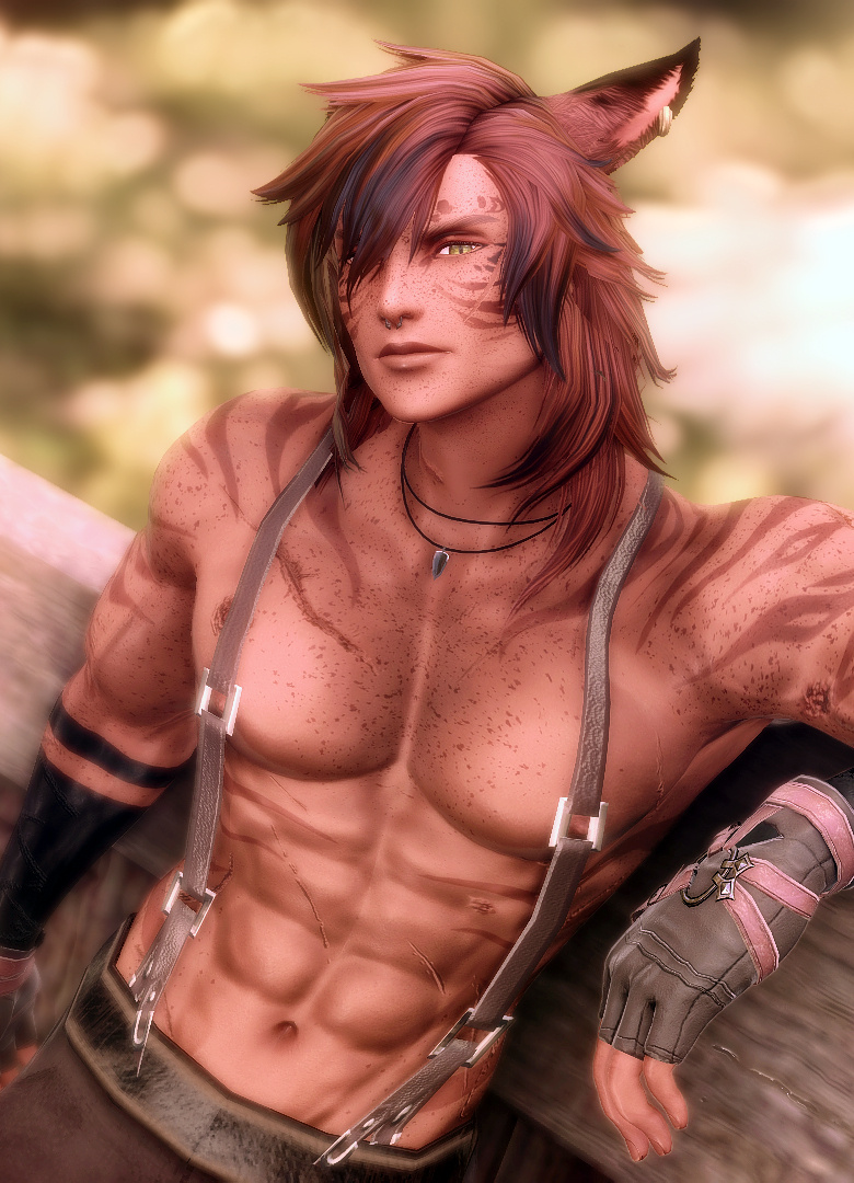 A striking Miqo'te and fierce gunbreaker hired to deal with a threat in Tailfeather, he also happens to be the partner of a certain lion. August is just getting to know him, but he respects his skill and his strength in combat. More than that, he's fascinating with stories written upon his skin.